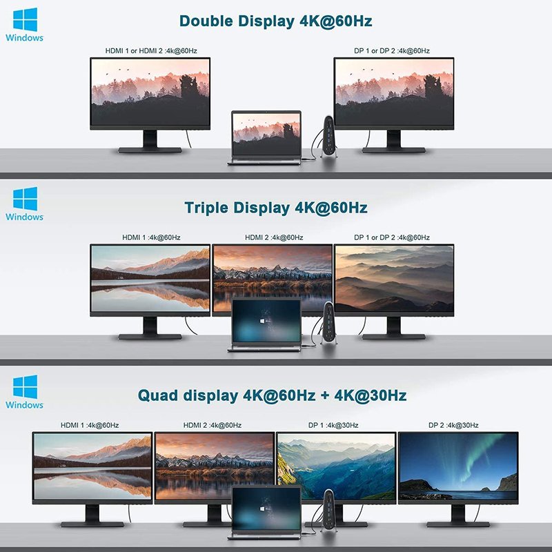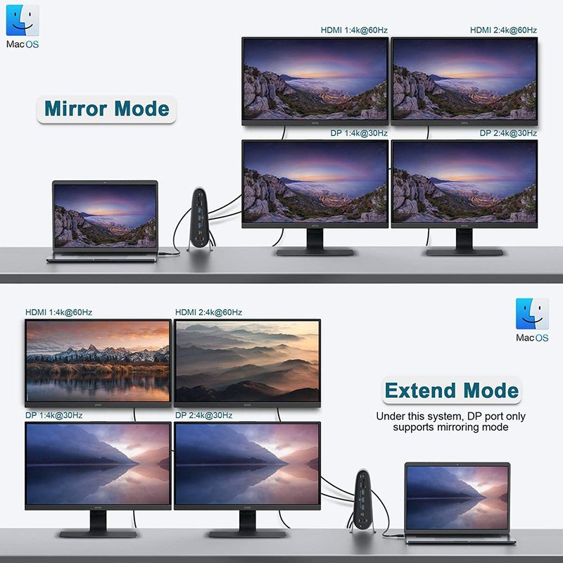 Ao utilizar 2 portas HDMI e 2 portas DisplayPort pode conectar até 4 ecrãs (quando ligado à porta Thunderbolt 3 do seu portátil). Para sistema operativo Mac OS poderá utilizar o modo Espelho (apenas com as portas HDMI) ou modo Expansão (apenas com as portas DisplayPort). Para sistema Windows poderá utilizar para modo Espelho ou Expansão tanto as portas HDMI como DisplayPort.