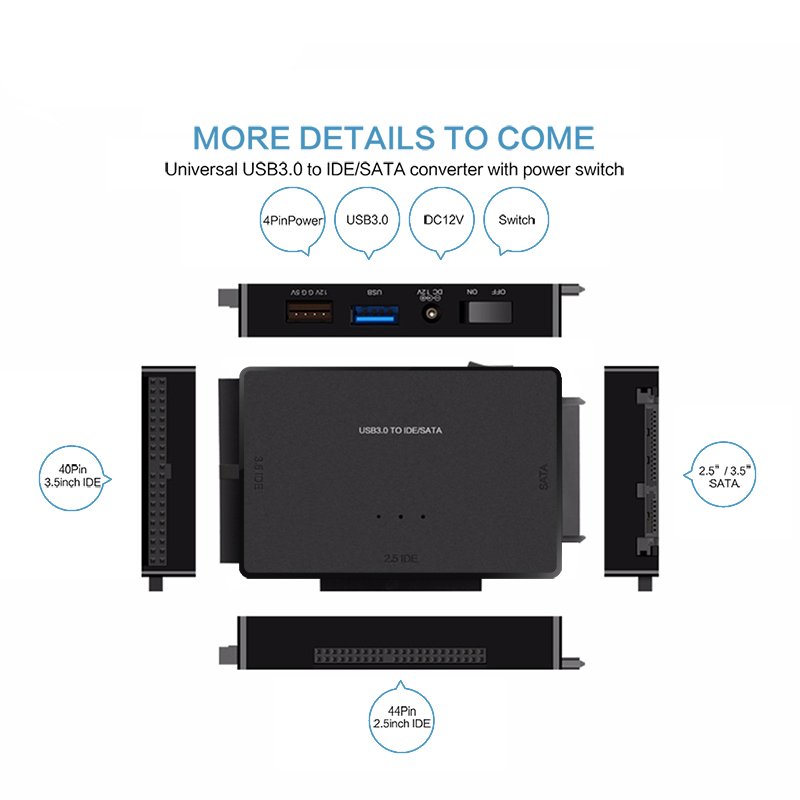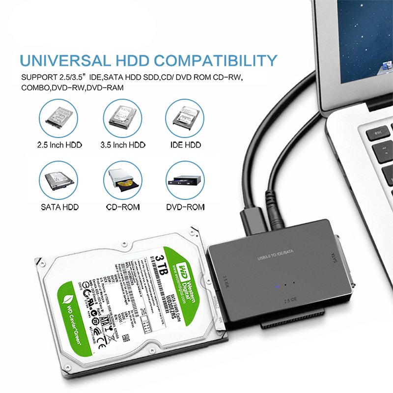 O conversor QGeeM USB 3.0 para SATA / IDE permite-lhe ligar discos rígidos SATA / IDE de 2,5"/3,5" através da porta USB ao seu computador. Esta é uma ferramenta perfeita para duplicar, copiar, fazer cópias de segurança, ou transferir grandes quantidades de dados de uma unidade para outra. Tem um conector SATA II e dois conectores IDE (40 pinos e 44 pinos).
