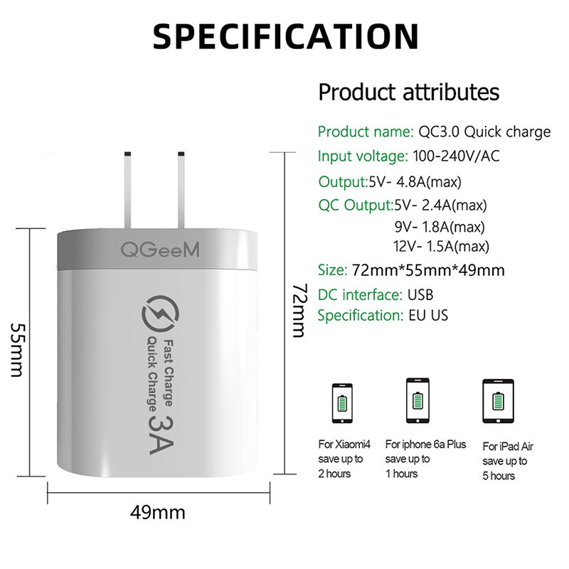 | Saída de carga rápida | 5V - 2.4A, 9V - 1.8A, 12V - 1.5A |